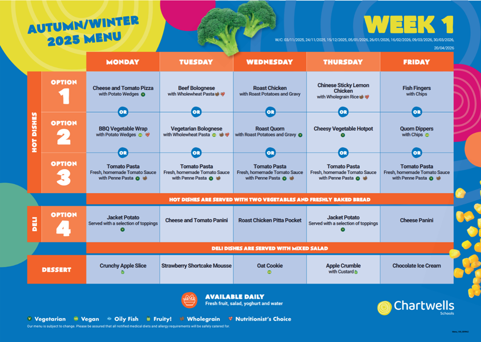 Chartwells is a leading school and education catering company who provide wholesome foods to primary, secondary schools, universities and colleges. They have a wonderful variety of meals, enabling all children to have a hot meal every day in school. Please ensure you top up your Scopay account for school dinners.