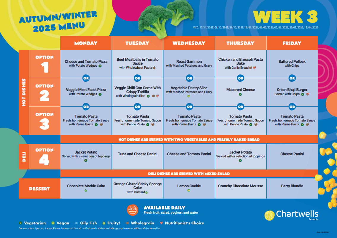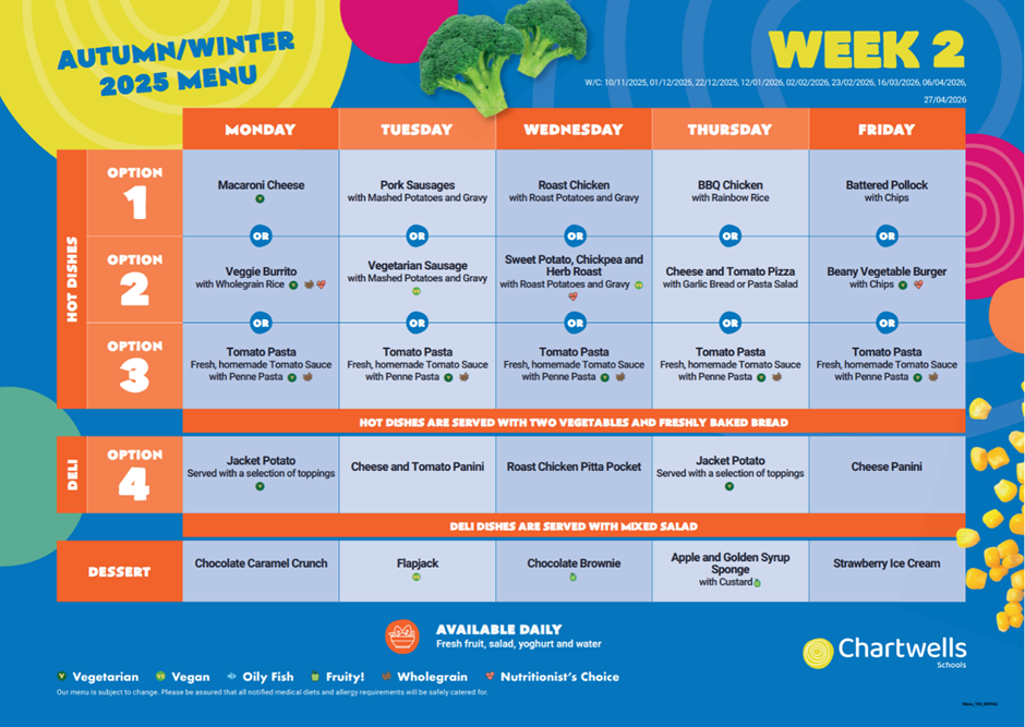 Chartwells is a leading school and education catering company who provide wholesome foods to primary, secondary schools, universities and colleges. They have a wonderful variety of meals, enabling all children to have a hot meal every day in school. Please ensure you top up your Scopay account for school dinners.